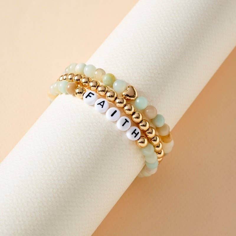 3 set of shinny gold plated CCB ball beads and natural stone beads stretch bracelets with FAITH inspiration.