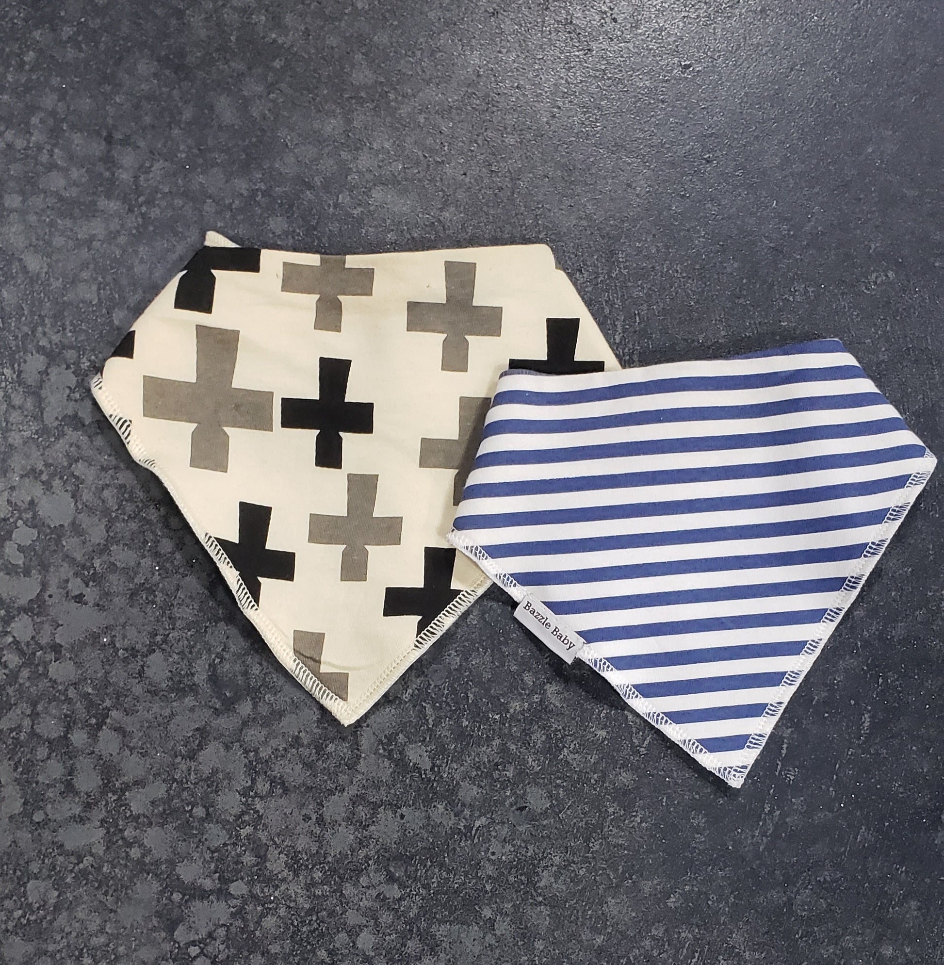 These stylish drool bibs are made of 100% absorbent cotton on the front and 100% polyester fleece on the back. The front of the bib is a stylish knit fabric, and the back is a super soft fleece that keeps your baby completely dry even with the drooliest of babies.