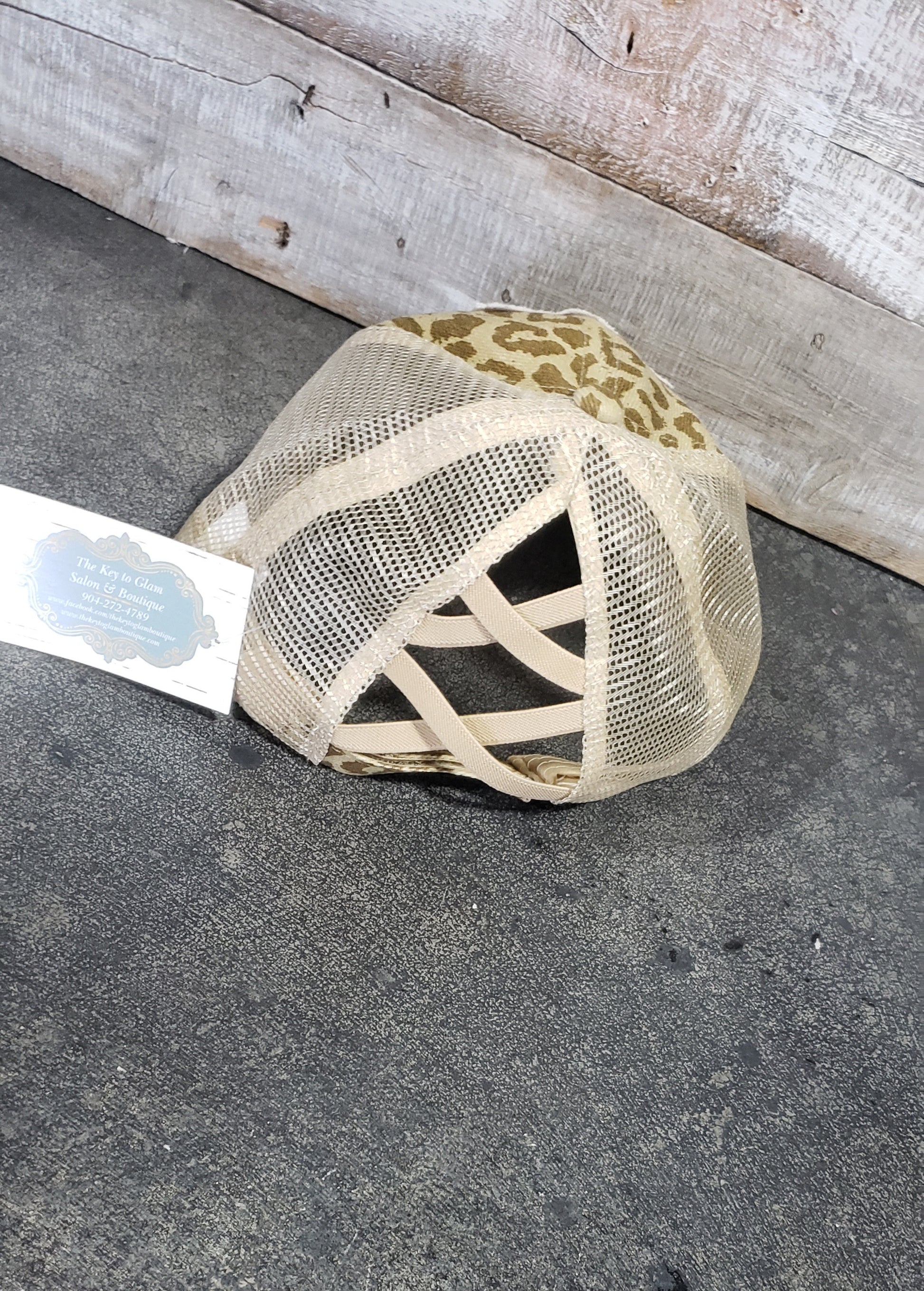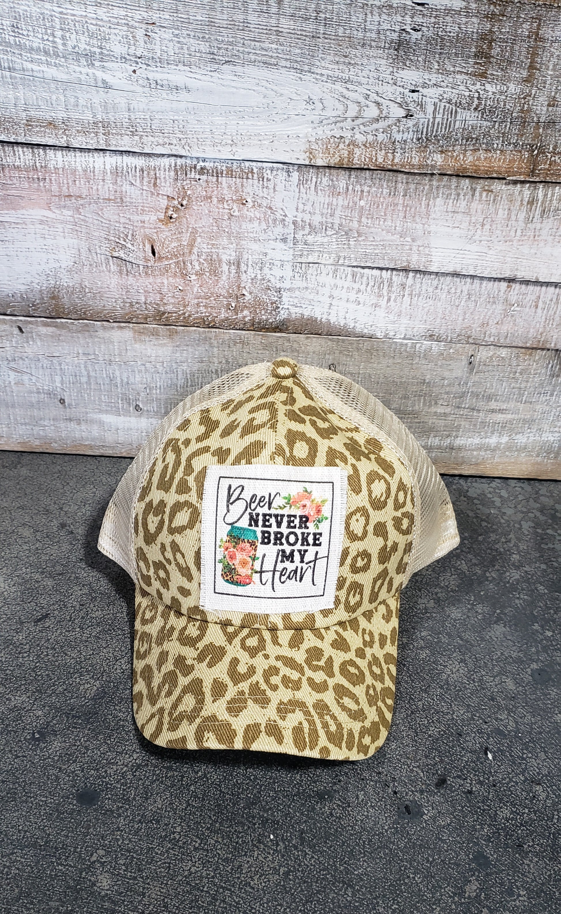 Leopard print Beer never broke my heart criss cross ponytail hat, distressed patch.