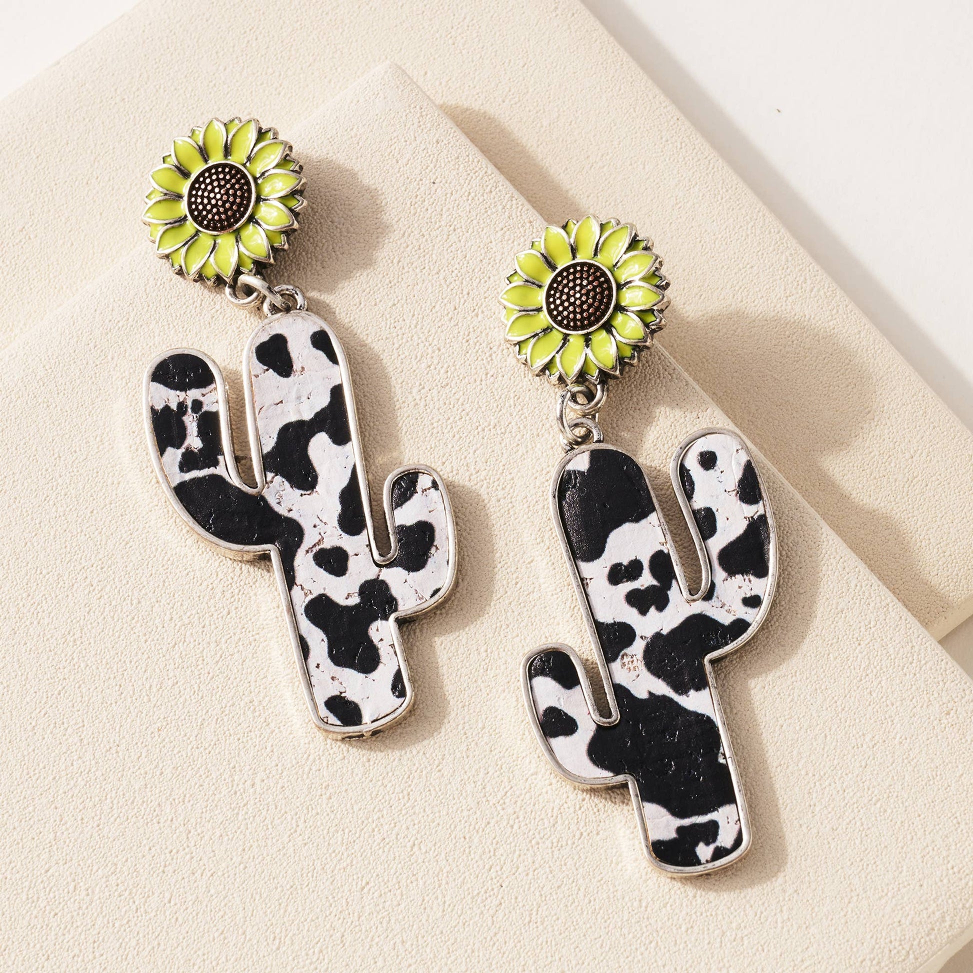 Cactus shaped dangling earrings with cow print and sunflower detail.