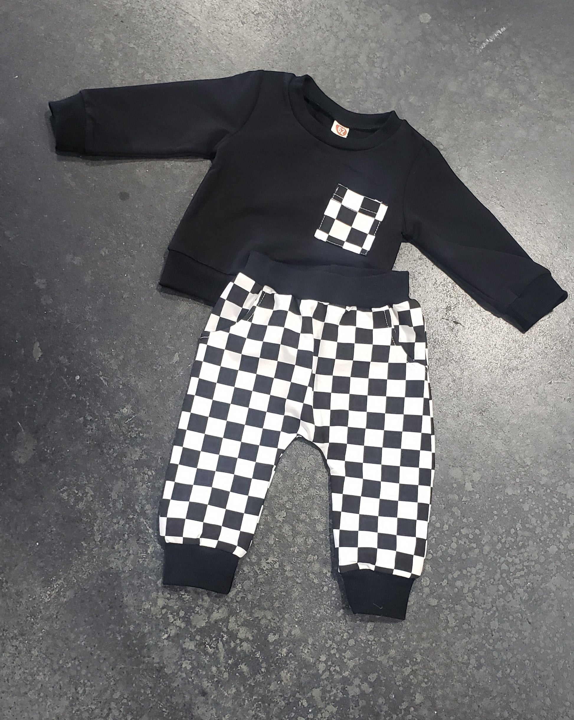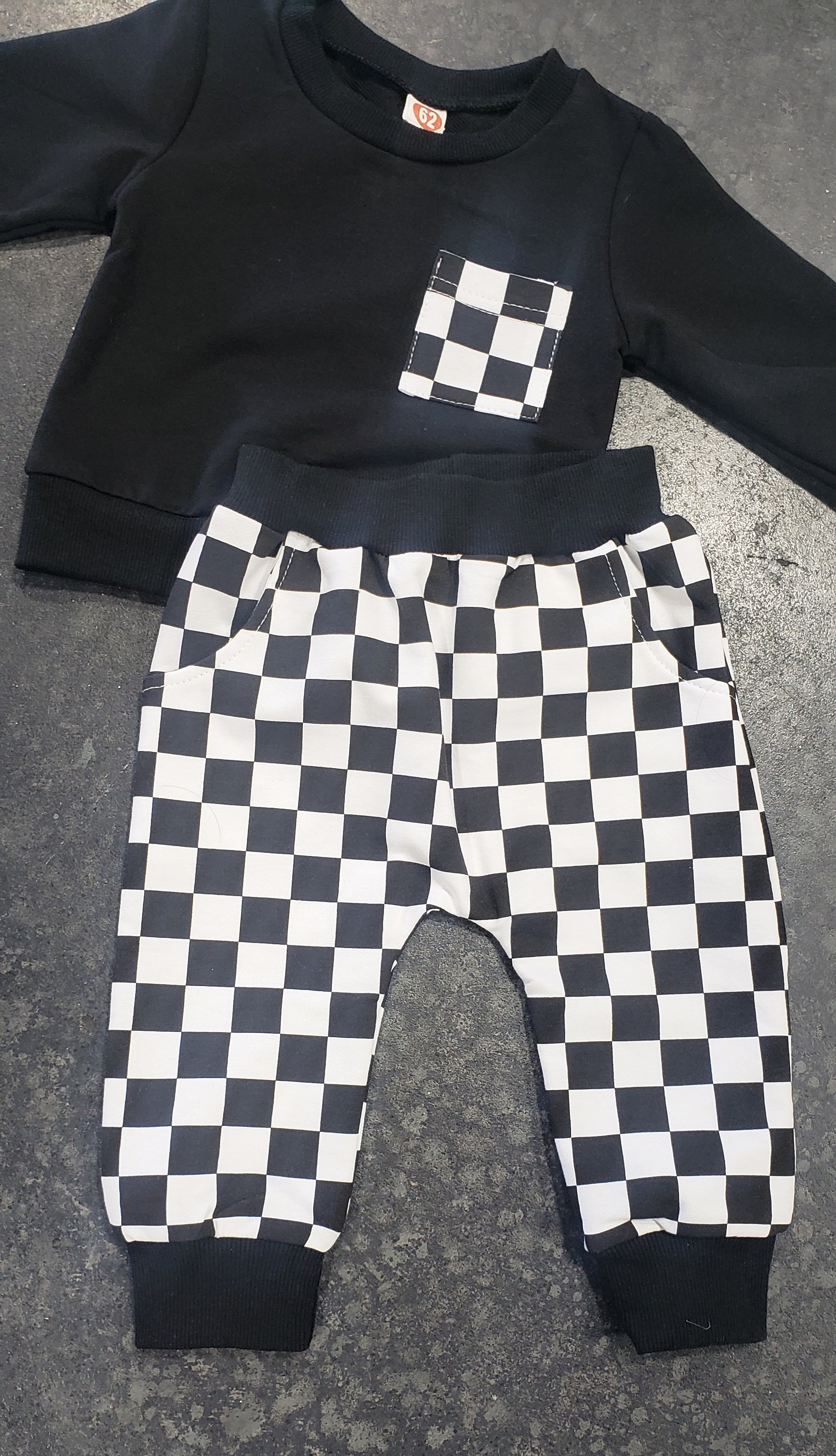 - Black and white checkered two-piece jogger set