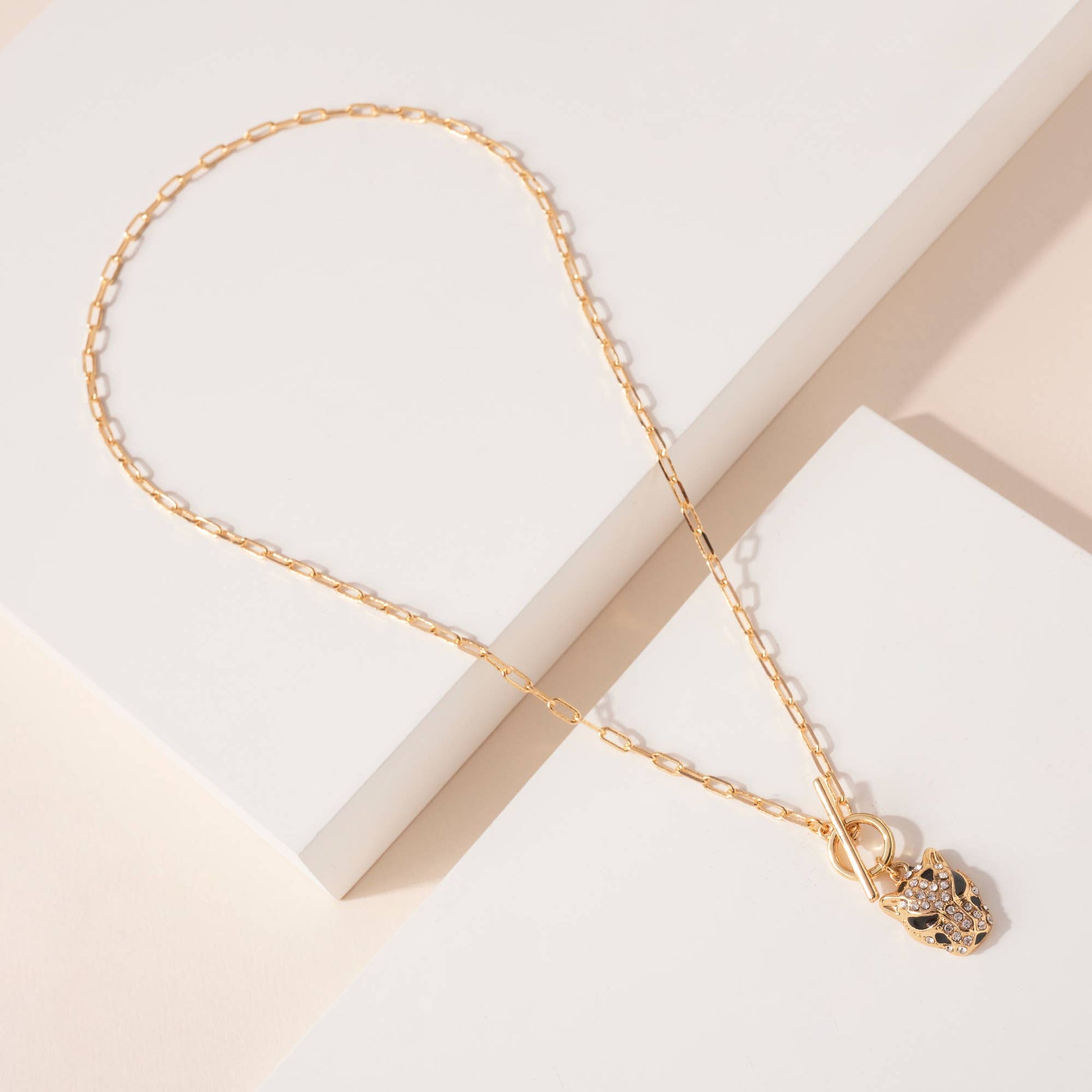 Chain necklace with cheetah head pendant with rhinestone detail.