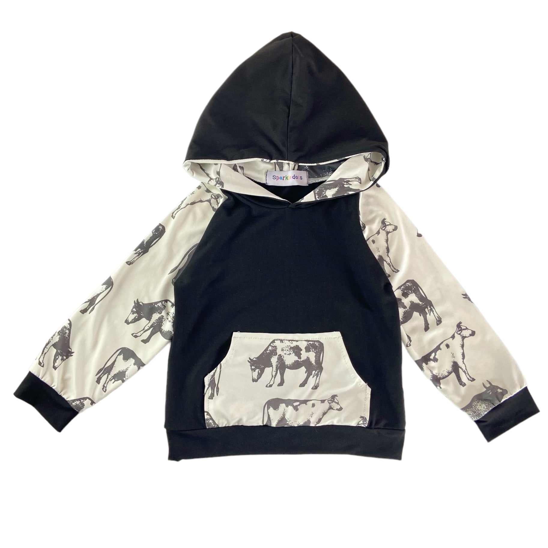 Moooo - this hoodie is ready to go with vintage style cows on the sleeves, pocket, and hood lining
