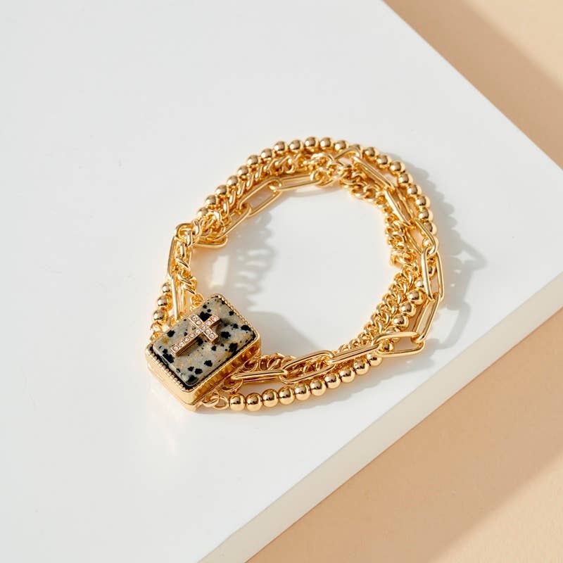 Ball chain, Gauge Wire chain, and Curb chain layered bangle with Cross accent rectangle shaped stone charm and magnetic closure
