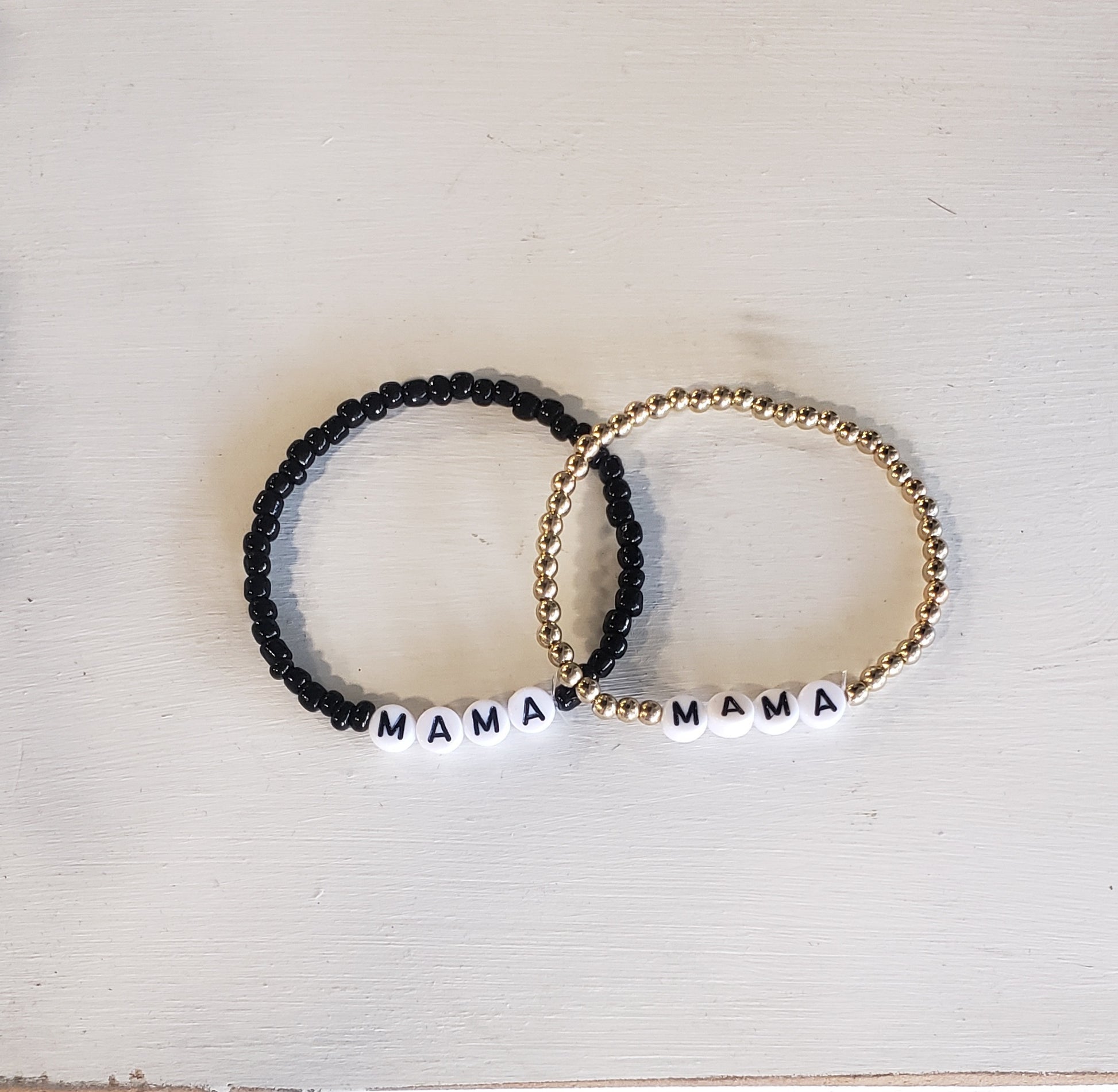Mama beaded bracelet. Stretchy. Black and gold available.