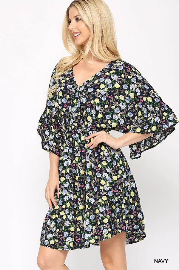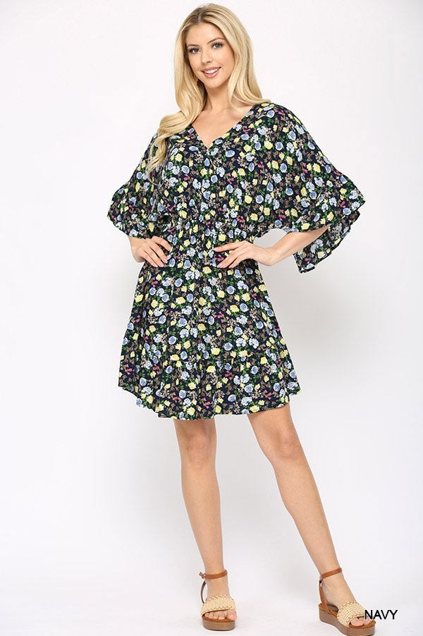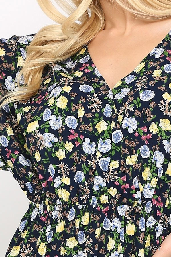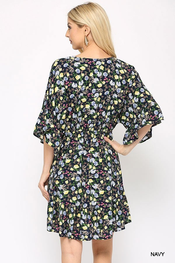 Floral Printed and Ruffle Detail Surplice Dress with Elastic Waist