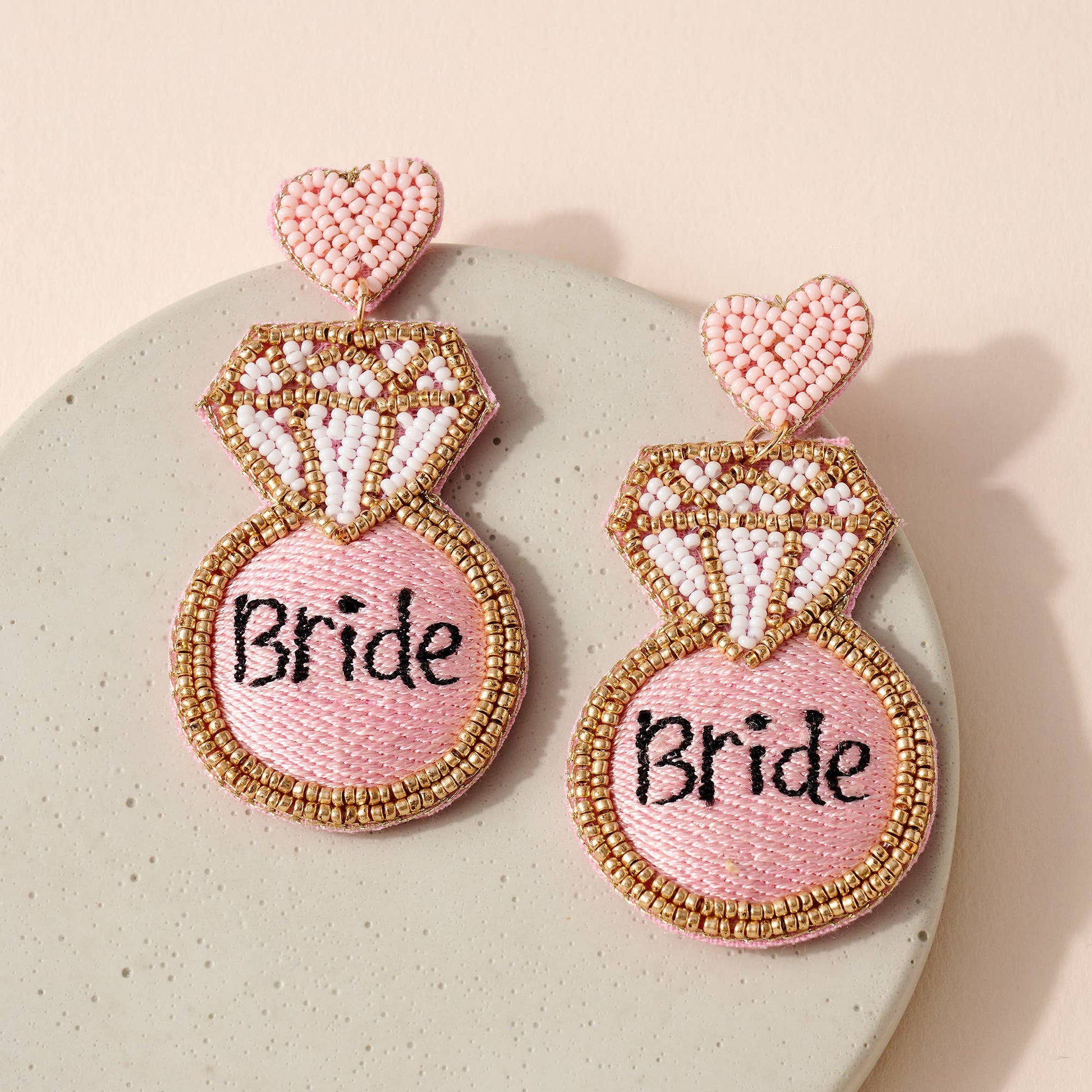 Seed beaded BRIDE text diamond engagement ring shaped dangling earrings.
