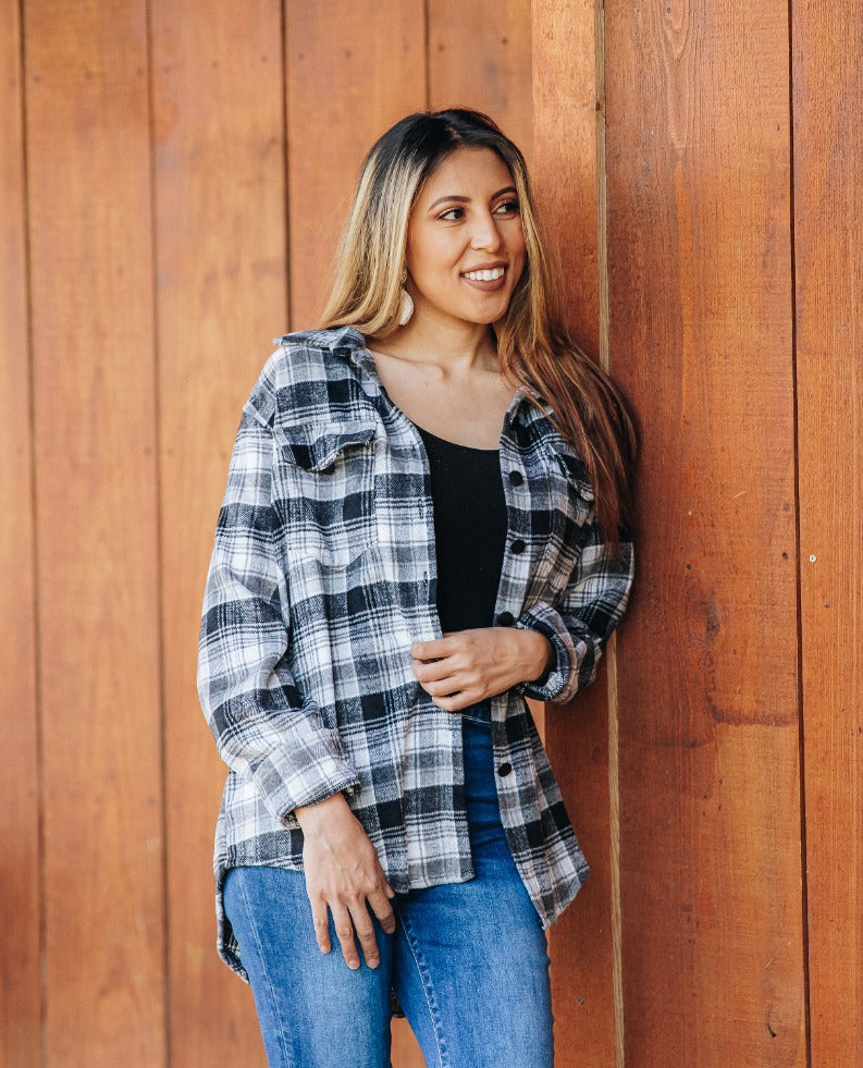 This flannel is perfect for layering in the cold months! The soft and cozy feel along with the plaid pattern makes this so easy to style with all of your fav outfits!