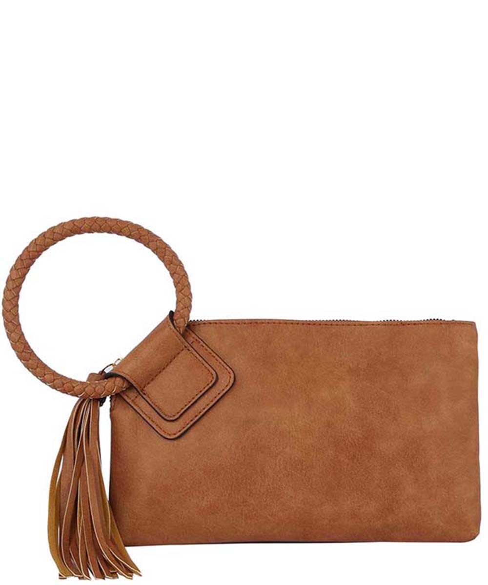 Zipper closure wristlet clutch. Vegan leather with braided and tassel accent. 1 zip pocket inside with 6 card slots